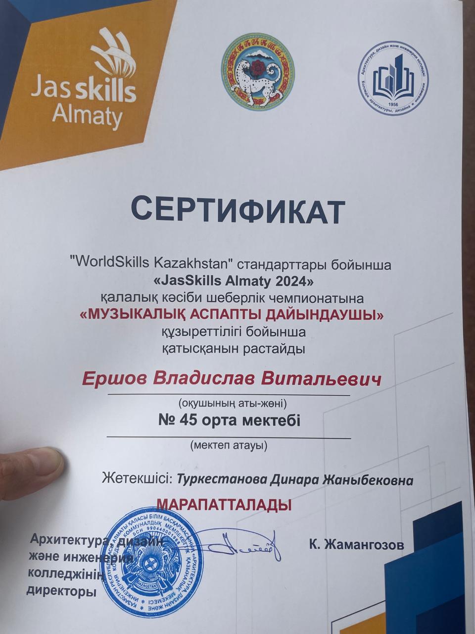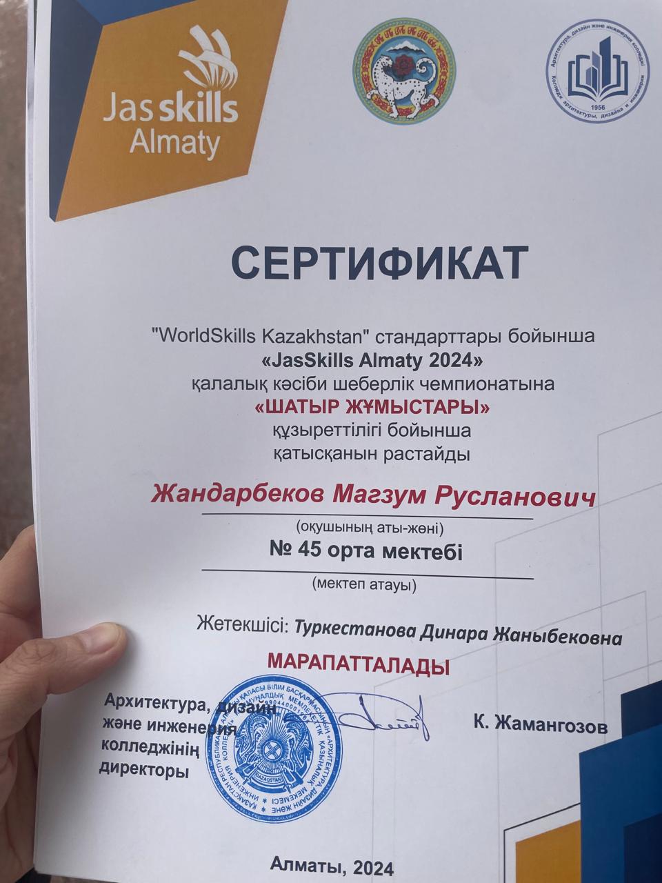 Алматыда «JasSkills» қалалық кәсіби шеберлік байқауы өтуде. Біздің 9В сынып оқушылары жетекші (Түркістанова Динара), Ершов Владислав және Жандарбеков Мағзұммен бірге үйірмеге шатыр жабу жұмыстары және домбыра жасау конкурсына қатыстып, оқушыларымыз колледжге ОҚУҒА ГРАНТ алды, құттықтаймыз!