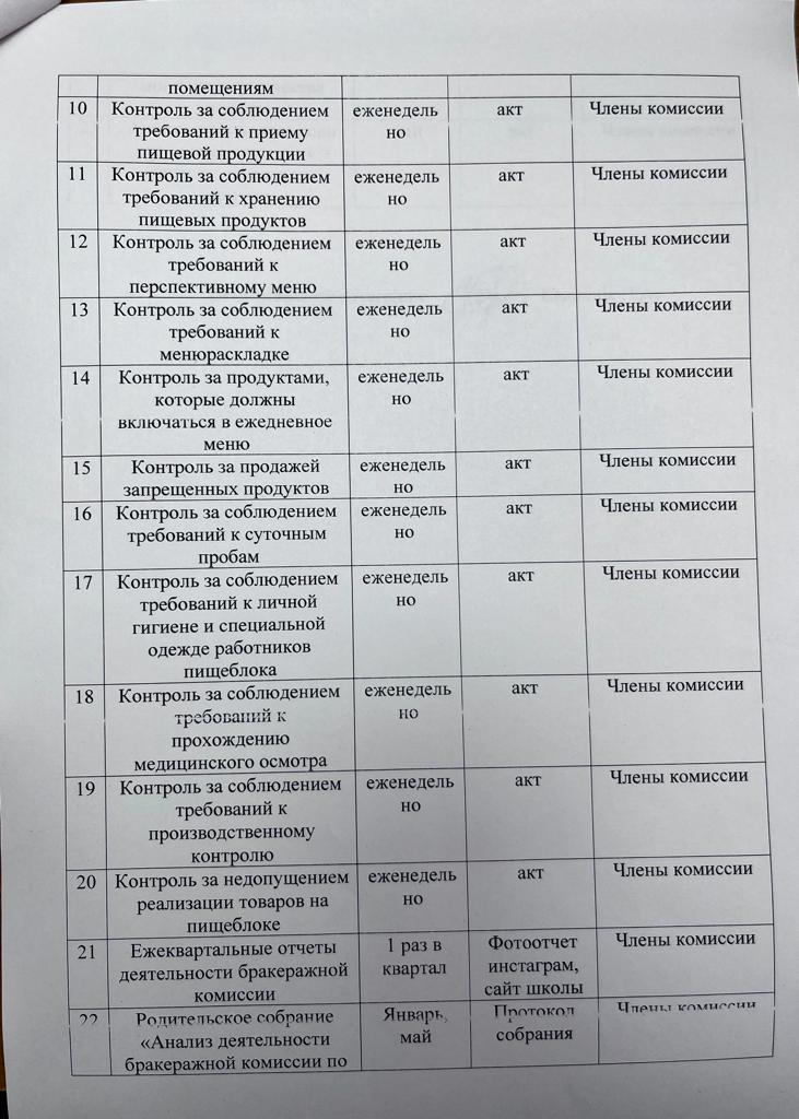 Тамақтану сапасының мониторингі жөніндегі комиссияның 2022-2023 оқу жылына арналған жұмыс жоспары. План работы комиссии по мониторингу качества питания на 2022-2023 учебный год