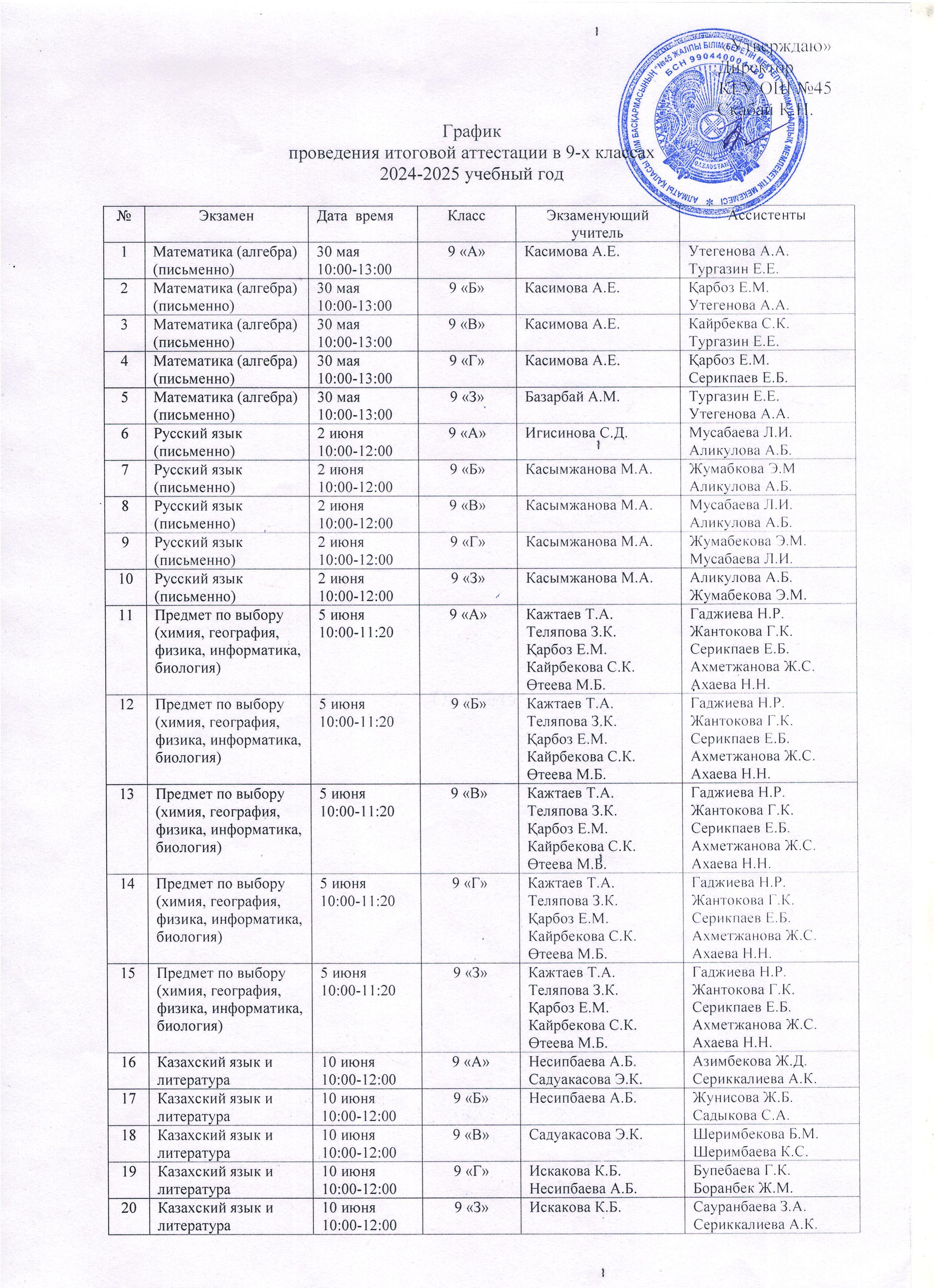 "№45 ЖББМ" КММ негізгі орта білім беру курсы үшін 2022-2023 оқу жылында қорытынды аттестаттауды өткізу кестесі. График проведения итоговой аттестаци