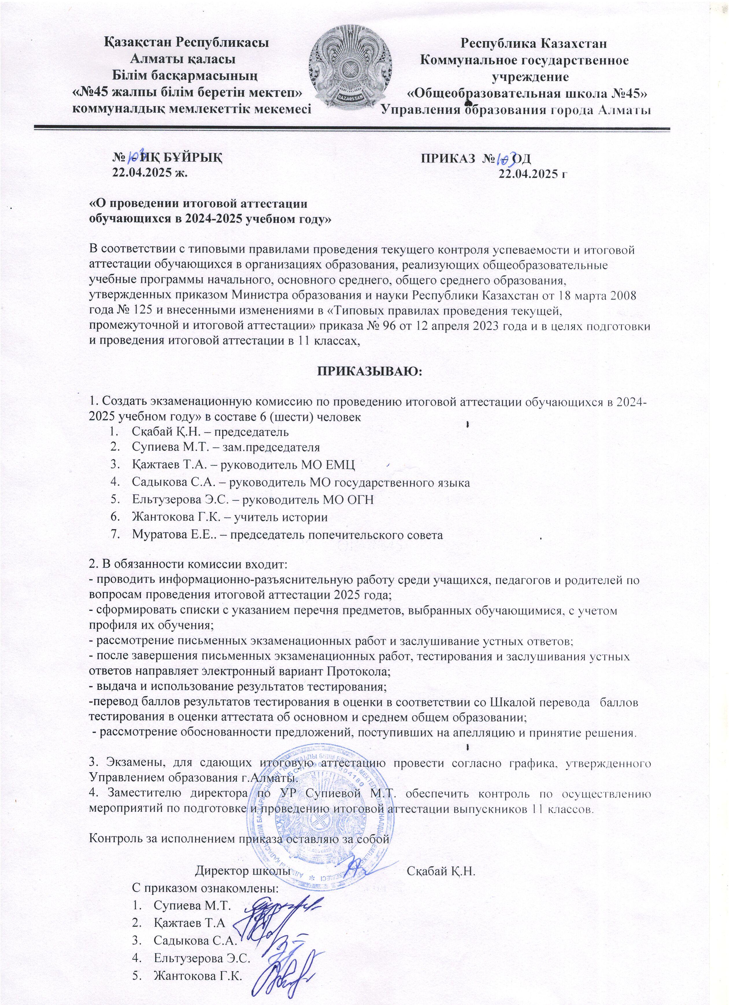 2024-2025 оқу жылындағы 9-11 сынып оқушыларын қорытынды аттестаттауды өткізу туралы бұйрық. Приказ о создании и проведении ИА обучающихся в 2024-2025 учебном году