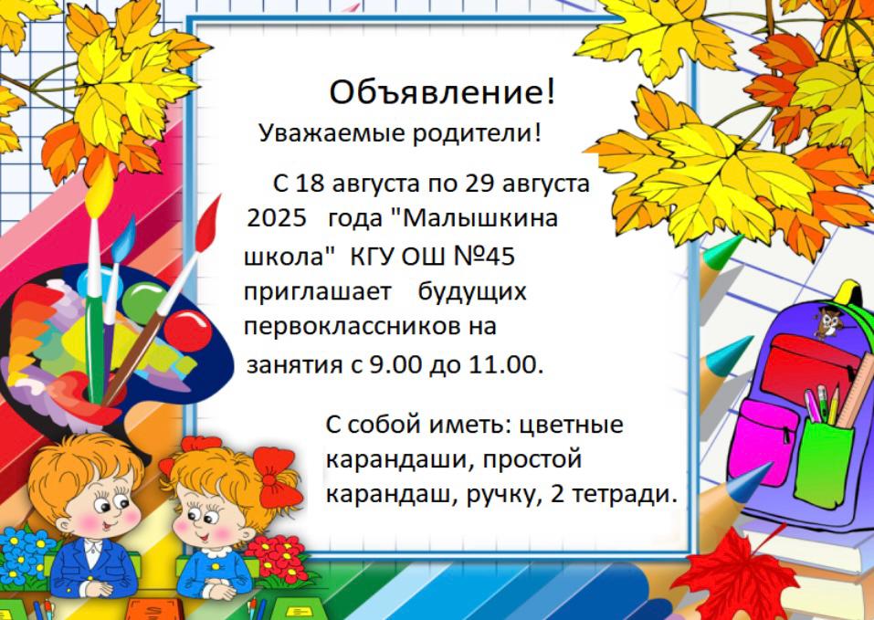Объявление!Уважаемые родители!С 18 августа по 29 августа 2025 года “Малышкина школа” КГУ ОШ №45 приглашает будущих первоклассников на занятия с 9.00 до 11.00.