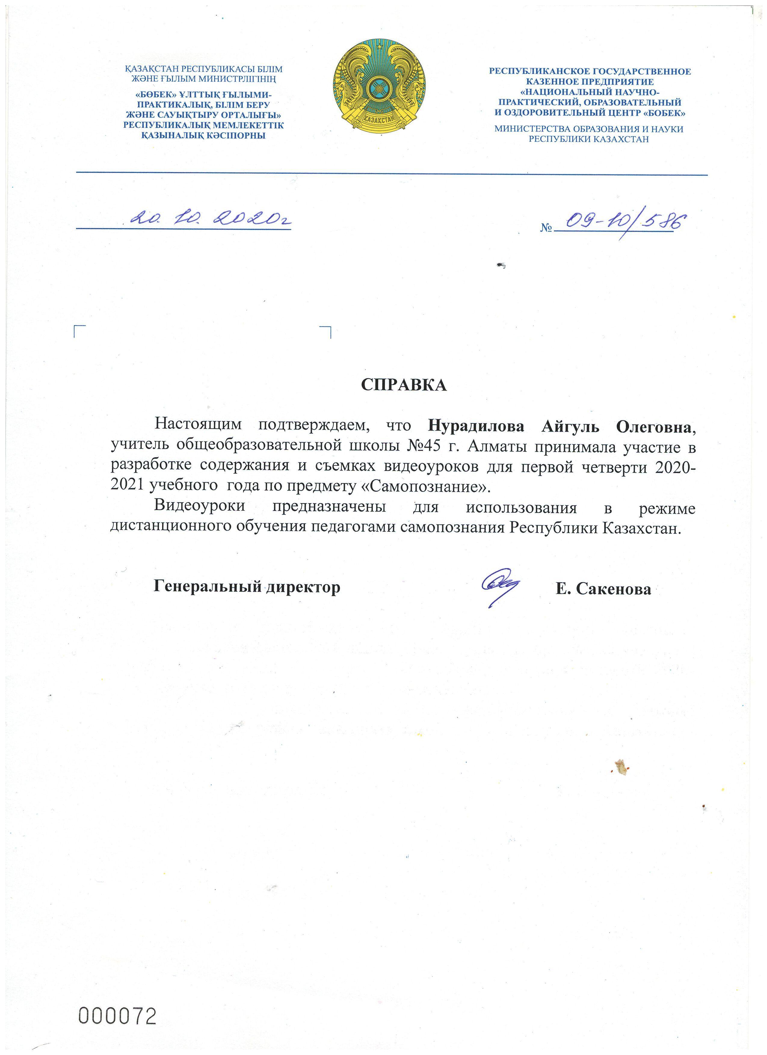 Учителю предмета "Самопознание" Нурадиловой Айгуль Олеговне объявлена благодарность от Президента фонда " Бобек" С.А.Назарбаевой за участие в разработке содержания и съёмках видеоуроков для I и II четверти 2020-2021 учебного года.
