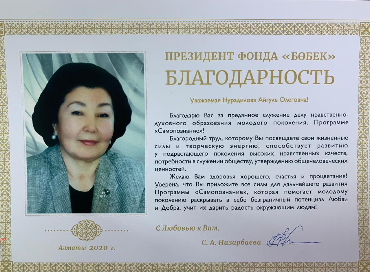 «Өзін-өзі тану» пәнінің мұғалімі Нурадилова Айгуль Олеговна 2020-2021 оқу жылының бірінші және екінші тоқсанындағы бейнесабақтардың мазмұнын әзірлеуге және түсіруге атсалысқаны үшін «Бөбек» қорының президенті С.А.Назарбаеваның алғысына ие болды. Бейнесабақтар қашықтан оқыту режимінде Қазақстан Республикасының өзін-өзі тану мұғалімдеріне пайдалануға арналған.