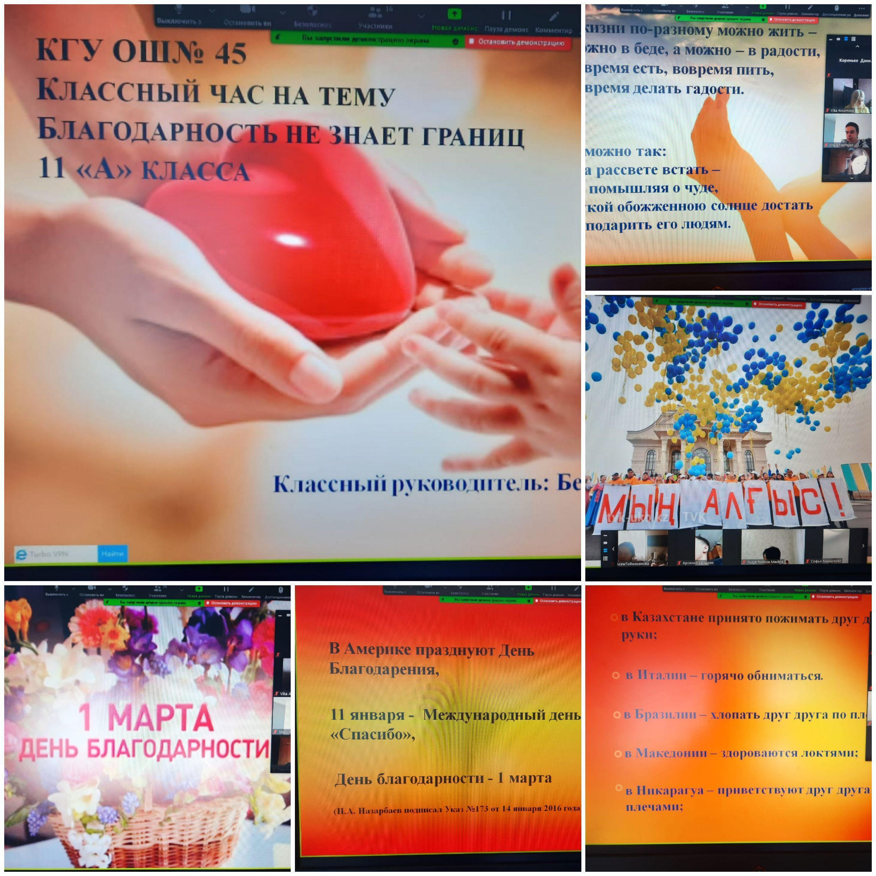 26.02.2021 года в КГУ ОШ №45 были проведены классные часы, посвященные 1 марта Дню Благодарности
