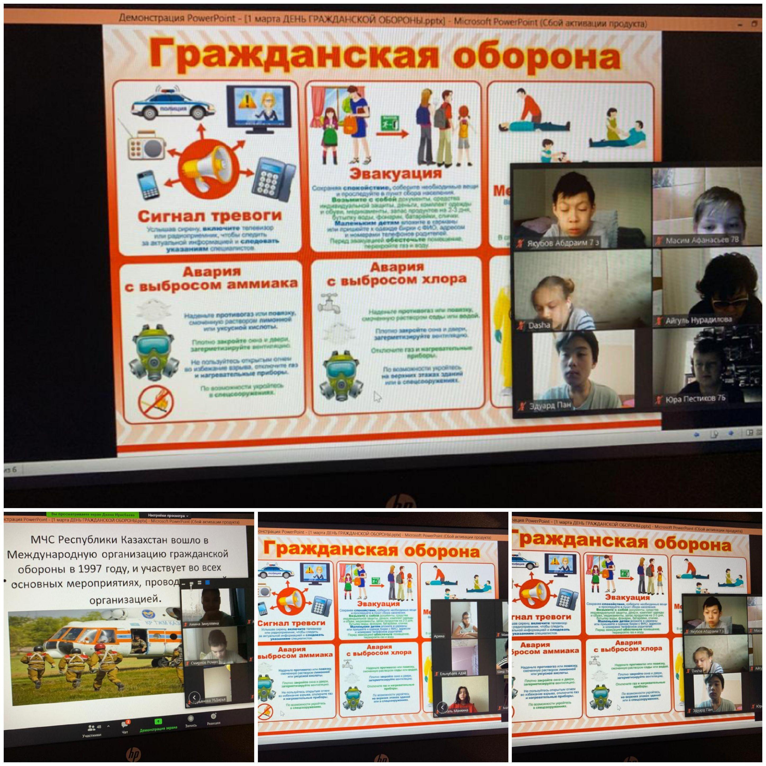 2021 жылдың 26 - ақпанында 1 - наурыз Азаматтық қорғаныс күніне арналған сынып сағаттары өтті.Сынып сағатын өткізудің мақсаты: 1.Оқушыларда «Азаматтық қорғаныс» ұғымын қалыптастыру 2. Төтенше жағдайларда қауіпсіз мінез-құлық дағдыларын үйрету