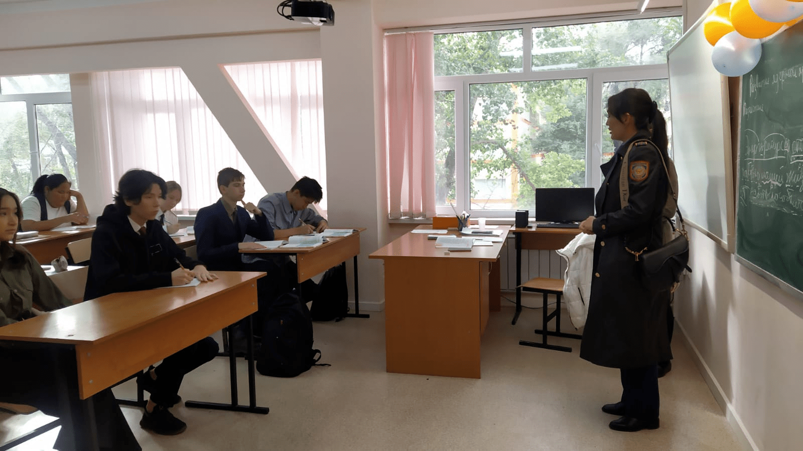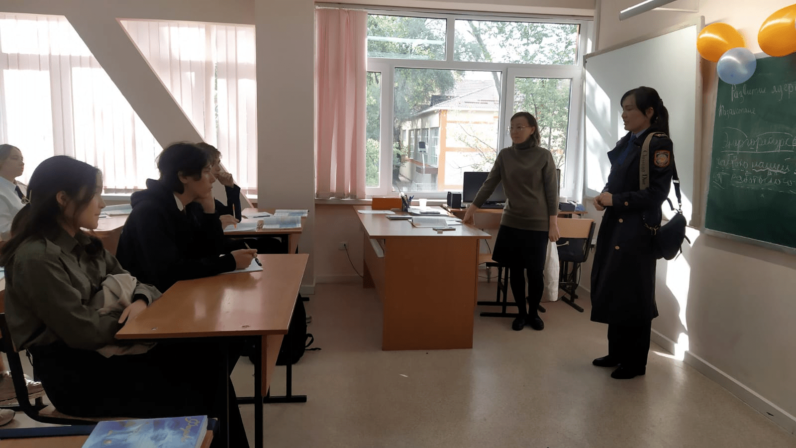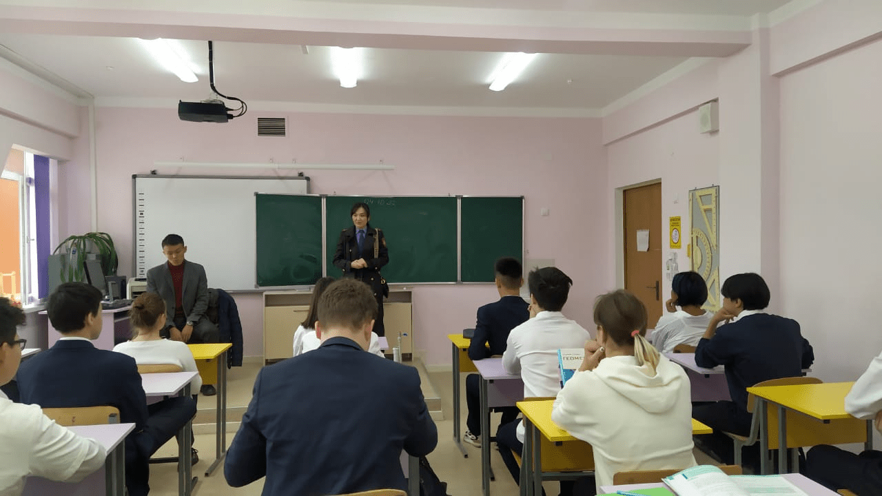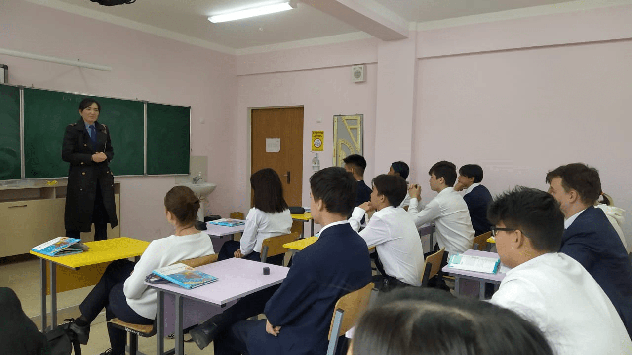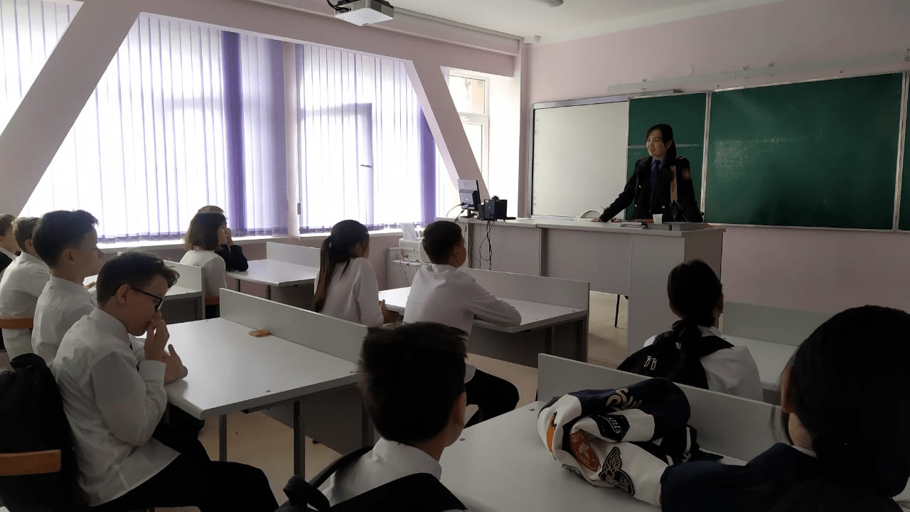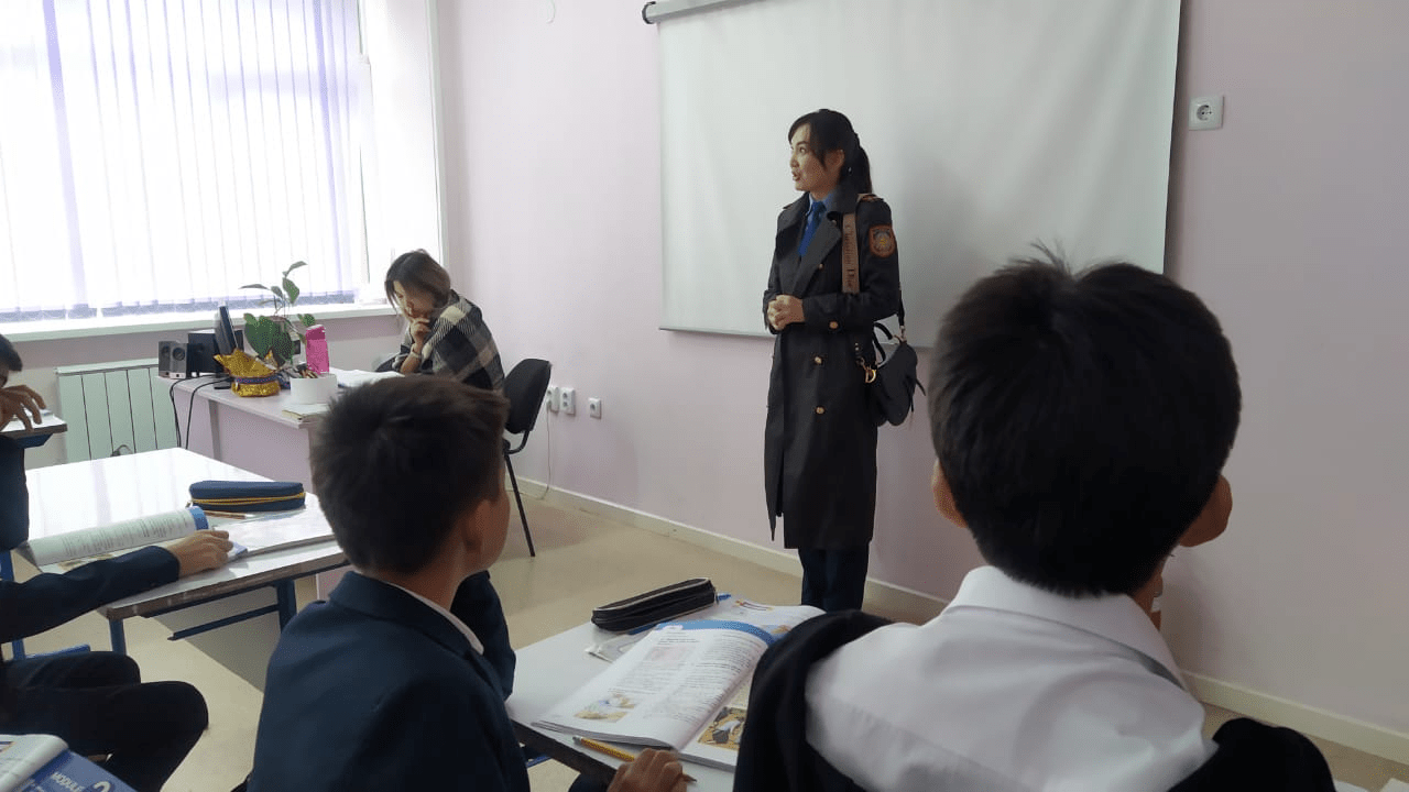 Мектептің кәмелетке толмағандар ісі жөніндегі учаскелік инспекторы полиция аға лейтенанты Ходжаниязова Айсанем Бахтиярқызы «Жасөспірімдер арасындағы құқық бұзушылықтың алдын алу» тақырыбында әңгіме өткізді.Школьный участковый инспектор по делам несовершеннолетних старший лейтенант полиции Ходжаниязова Айсанем Бахтияровна провела беседу на тему "Профилактика правонарушений среди подростков".