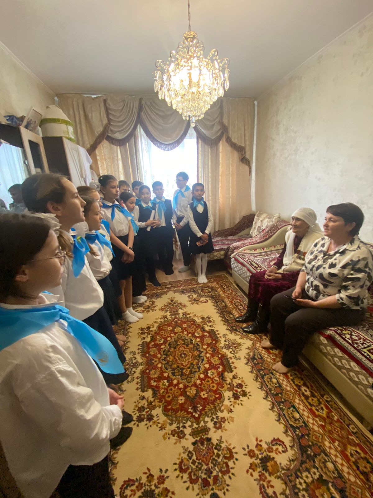 Под пронизывающим светом исторической памяти, ученики пятых классов, под руководством своих классных руководителей, собрались, чтобы преподнести свои искренние почести тем, кто внес непеременный вклад в защиту нашей свободы. Ребята посетили ветерана Великой Отечественной войны Калабаеву Кумискуль. Их детские сердца наполнились глубоким уважением к ветеранам Великой Отечественной войны. Слова признательности, прозвучавшие из уст юных патриотов, звучали как возвышенная молитва за мир и благополучие. Этот момент слияния поколений стал возвышенным доказательством того, что память о подвиге наших предков навсегда сохранится, ярко освещая путь к будущему.