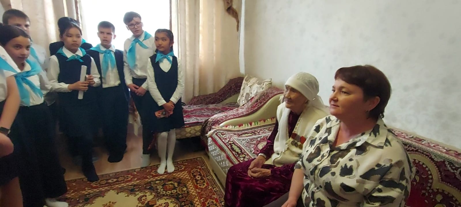 Балалар Ұлы Отан соғысының ардагері Қалабаева Күміскүлге қонаққа барды. Ребята посетили ветерана Великой Отечественной войны Калабаеву Кумискуль