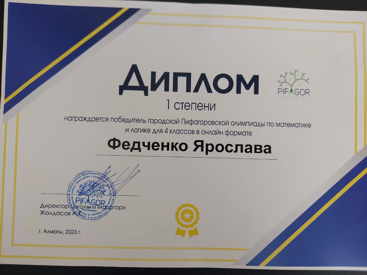 "Алматы Дарыны" "Пифагор" мектебімен бірлесе өткізген математикадан 4 сынып оқушылары арасында өткізген онлайн "Пифагор" олимпиадасының, қалалық кезеңінің жеңімпазы Федченко Ярослава 1- дәрежелі Диплом. Федченко Ярослава победитель "Пифагорской" олимпиады городского этапа по математике среди 4 кл. организованной "Алматы Дарыны" совместно со школой "Пифагор" Диплом 1- степени.