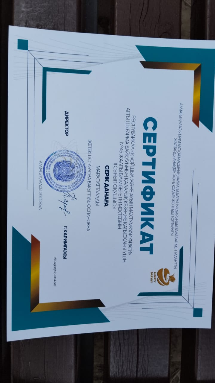 06 маусым 2024 0 1 2 3 4 5 Шығарма байқауы Республикалық "Ойшыл және ақын Махтумкули Фраги" шығарма байқауының қалалық кезеңінің жеңімпазы 10 сынып оқушысы Серік Дана 2 жүлделі орынды иеленді. Жетекшісі: Абуова Б.О.