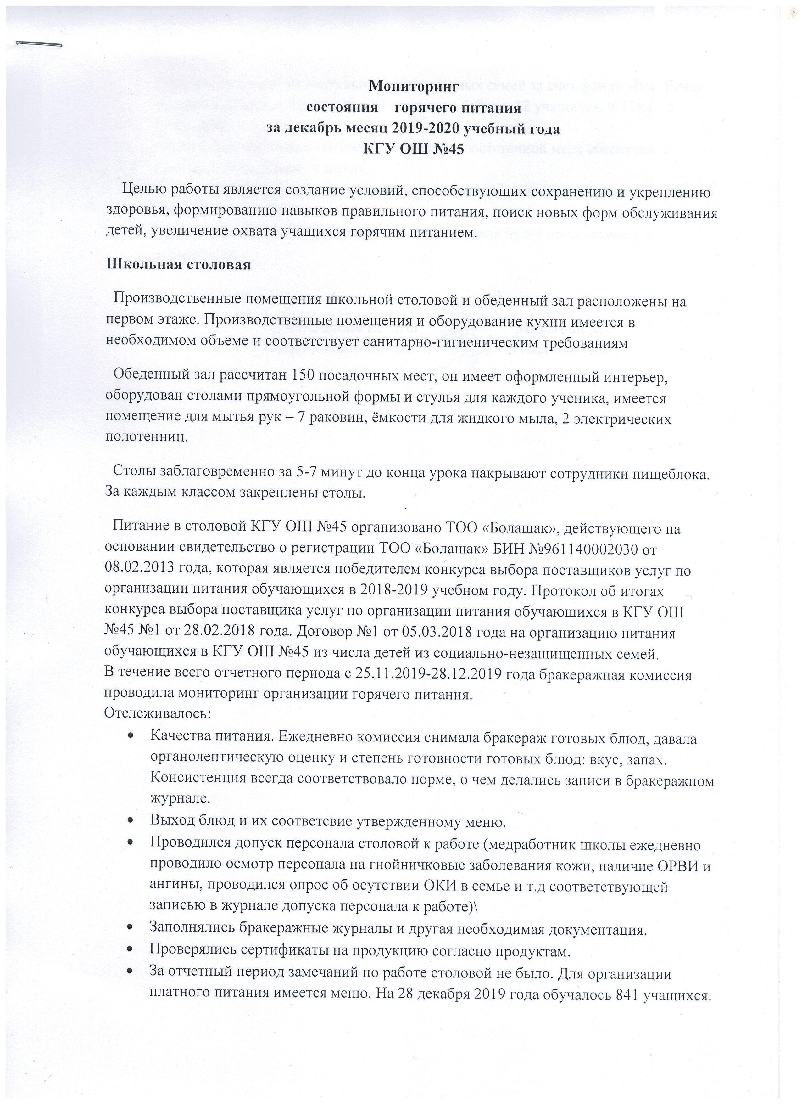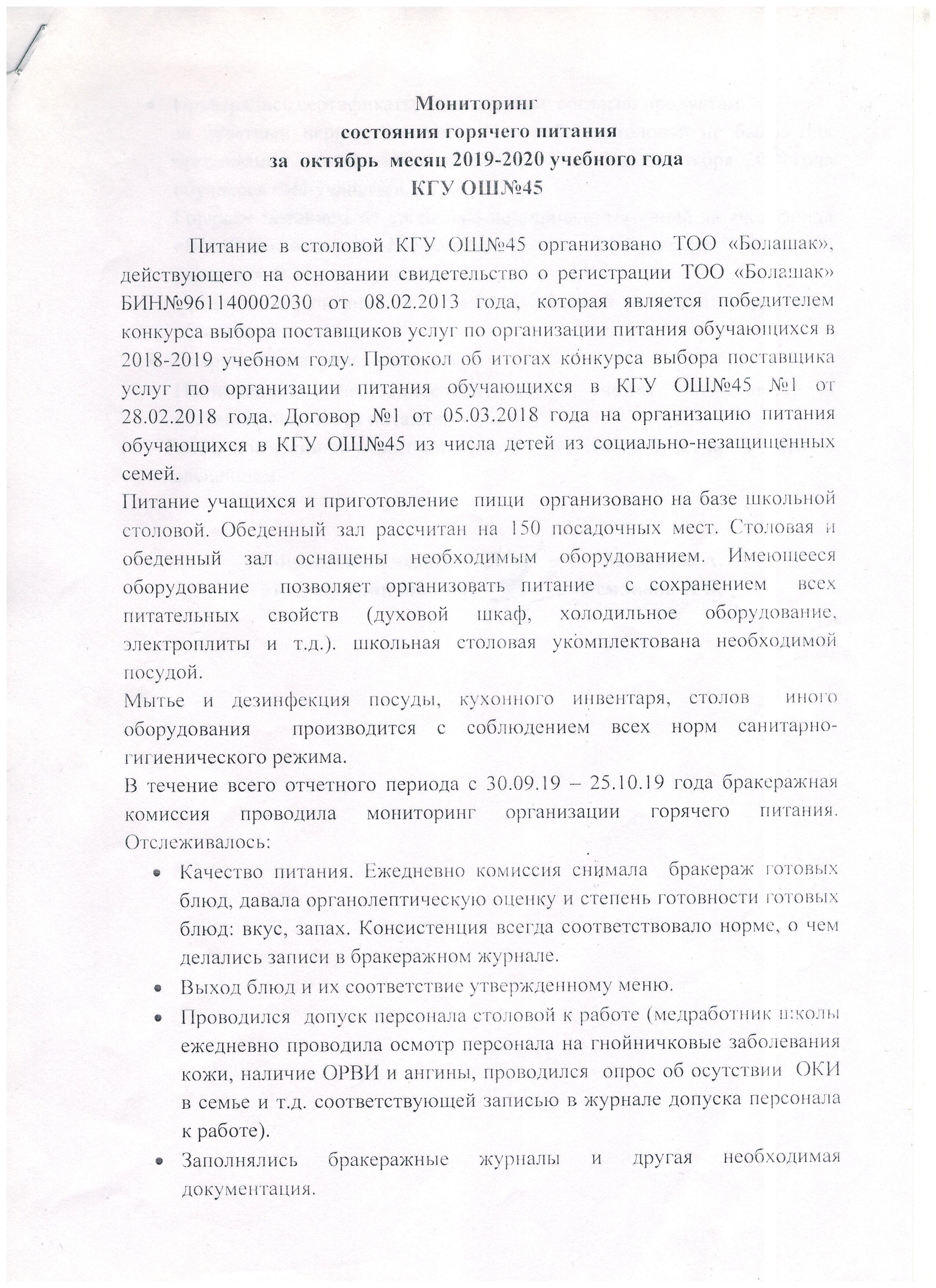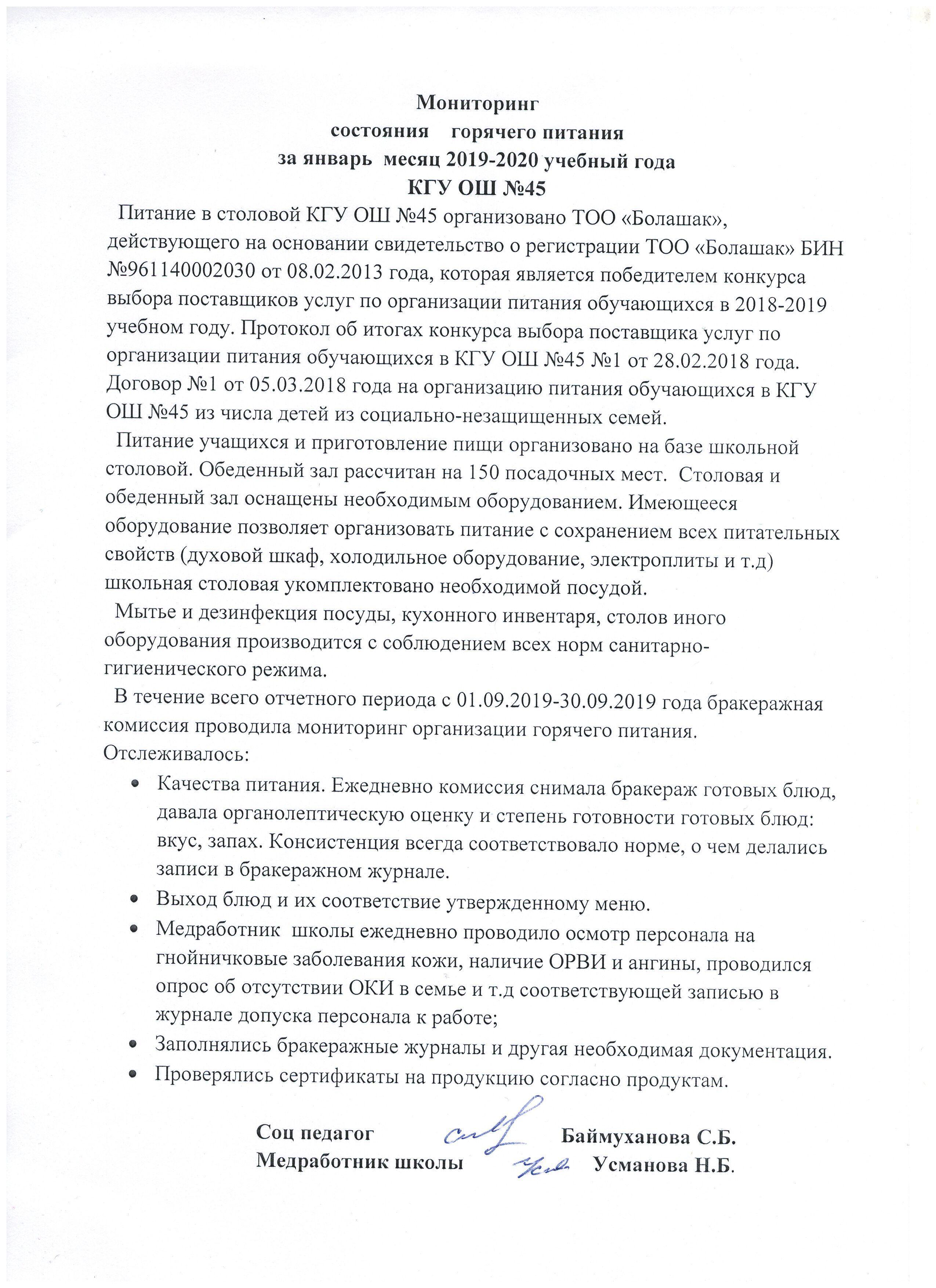 Тамақтану сапасының мониторингісі 2019ж, І жарты жылдық. Мониторинг качества питания 2019 год, I полугодие