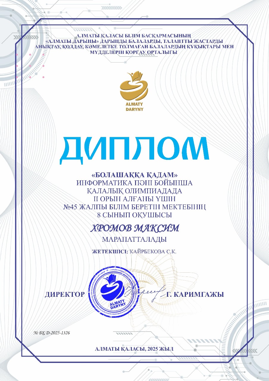 Информатика пәнінің мұғалімі Қайырбекова Самал Қылышбекқызын оқушыларды олимпиадаға дайындығы үшін және қалалық «Болашаққа қадам» олимпиадасында жүлделі орын алған оқушыларды құттықтаймыз: 10 сынып оқушысы Цай Тимур - 1 орын, 7 сынып оқушысы Избасаров Даниал - 1 орын, 8 сынып оқушысы Хромов Максим - 2 орын. Сізге шығармашылық табыс тілейміз!