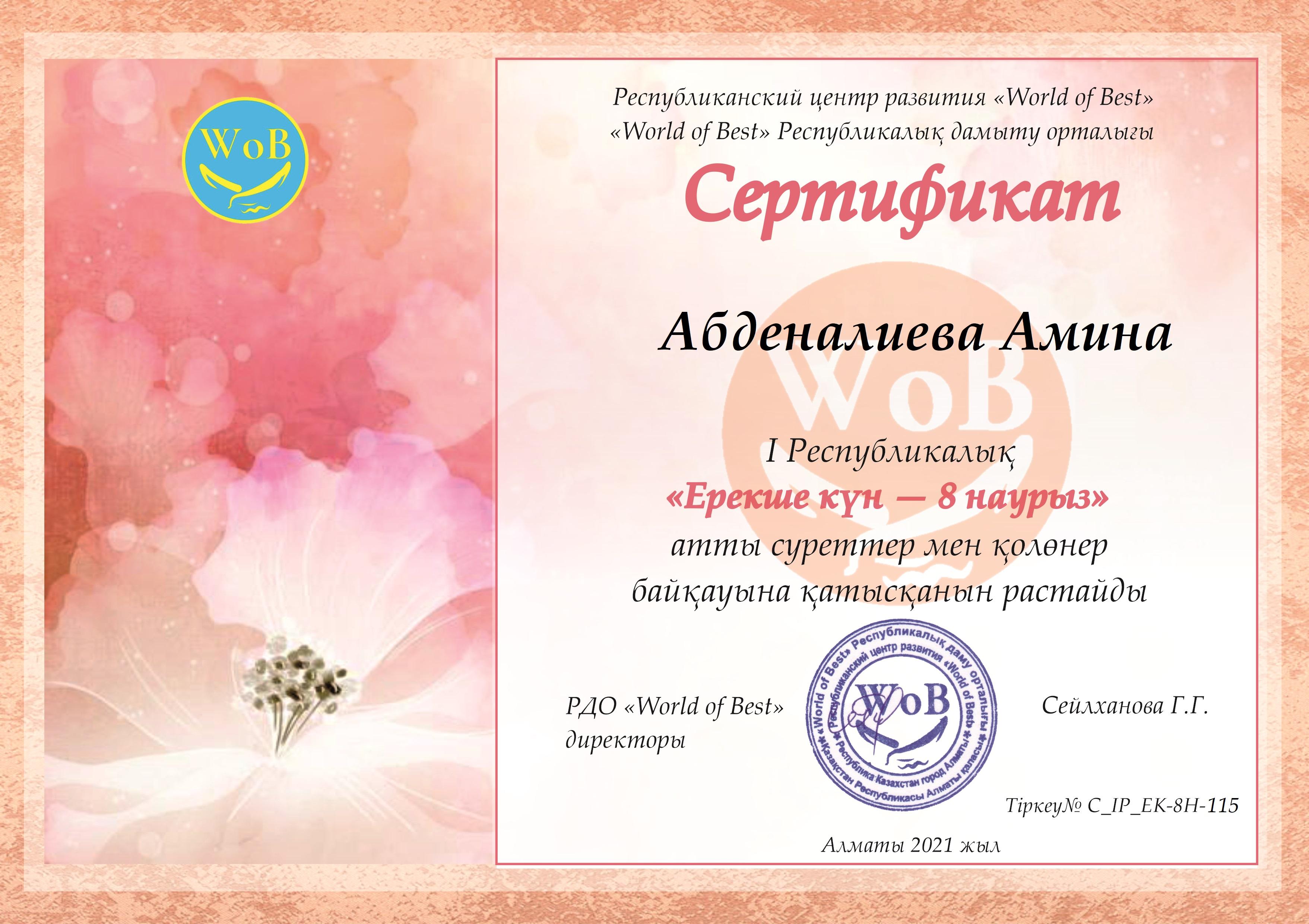 09 наурыз 2021 0 1 2 3 4 5 Достижение школьников Поздравляем победителей I Республиканского конкурса "Особенный день- 8 марта" Новолодскую Ирину и Абденалиеву Амину!